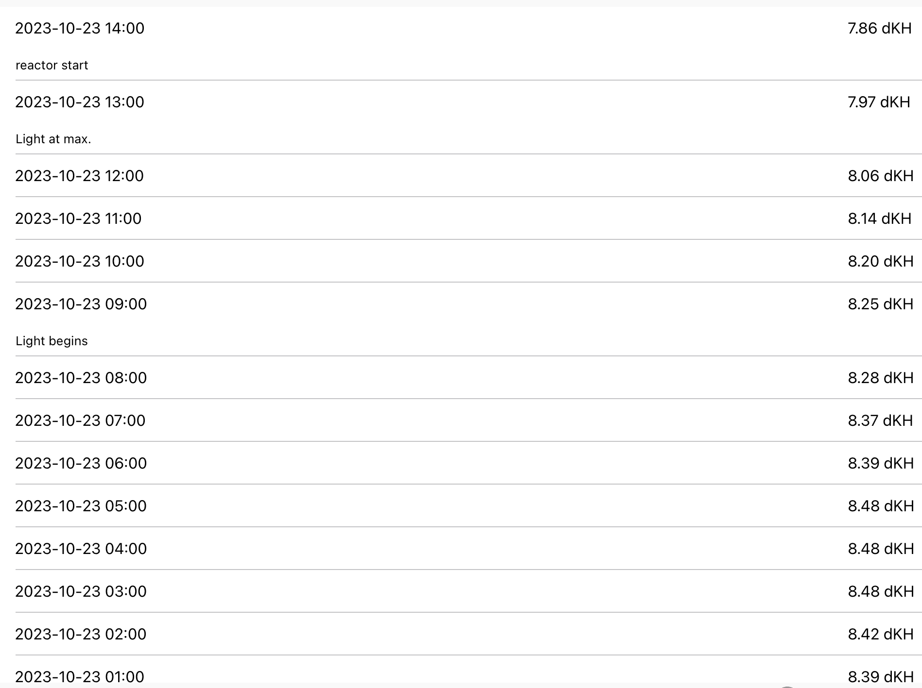 Er faldet med 0,11 dKH på 1 time i forhold til aflæsningen på alkatronic i Max lys perioden