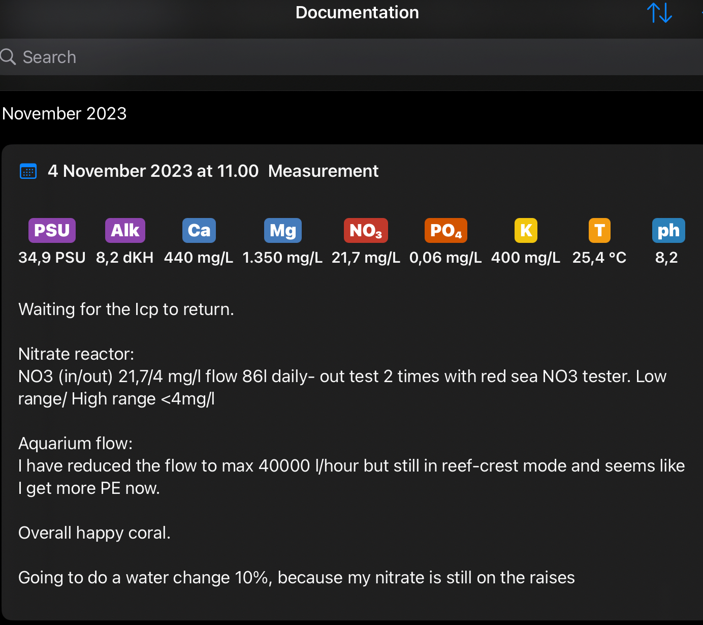 Jeg håber at komme ned mellem no3 mellem 5-10mg/l og po4 mellem 0,05-0,1 som jeg har haft i lang tid. Den vilde stigning kom efter alle de fisk kom i😱