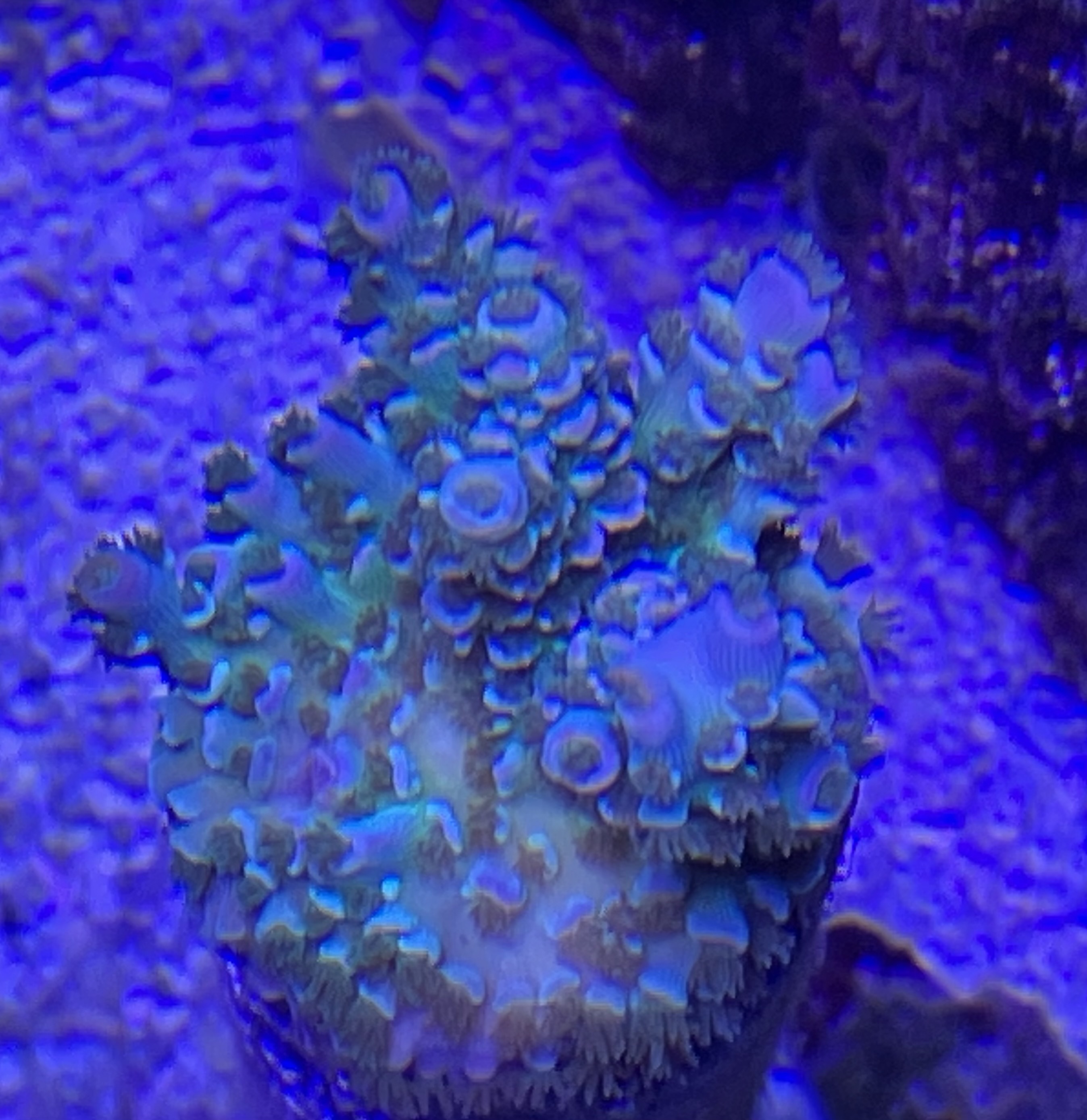 Jeg skal nok snart tage billeder af mine guldklumper (Acro'er) men vil lige anskaffe et farvefilter fra Orphek først, så man ser andet end blåt lys![]()