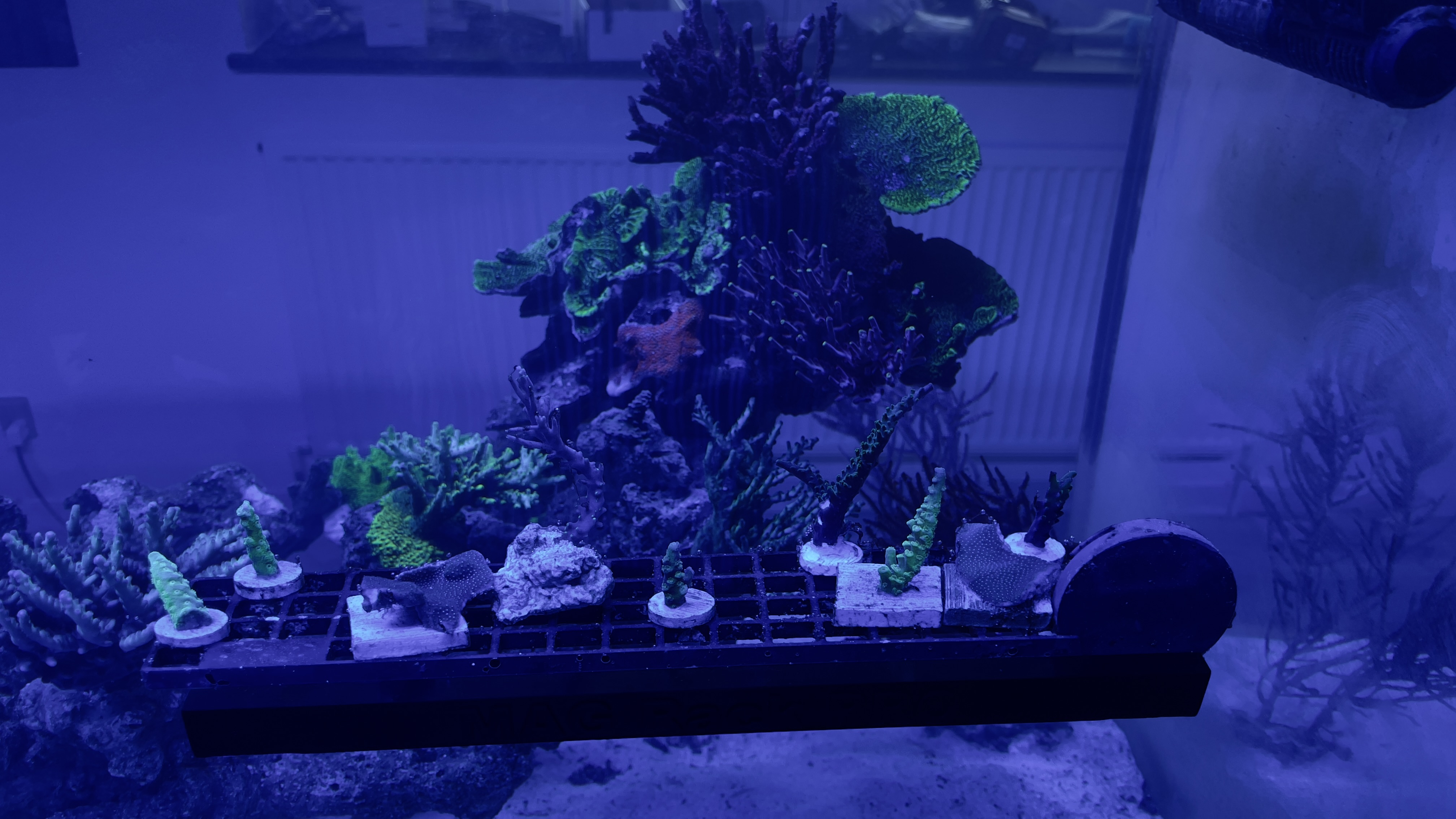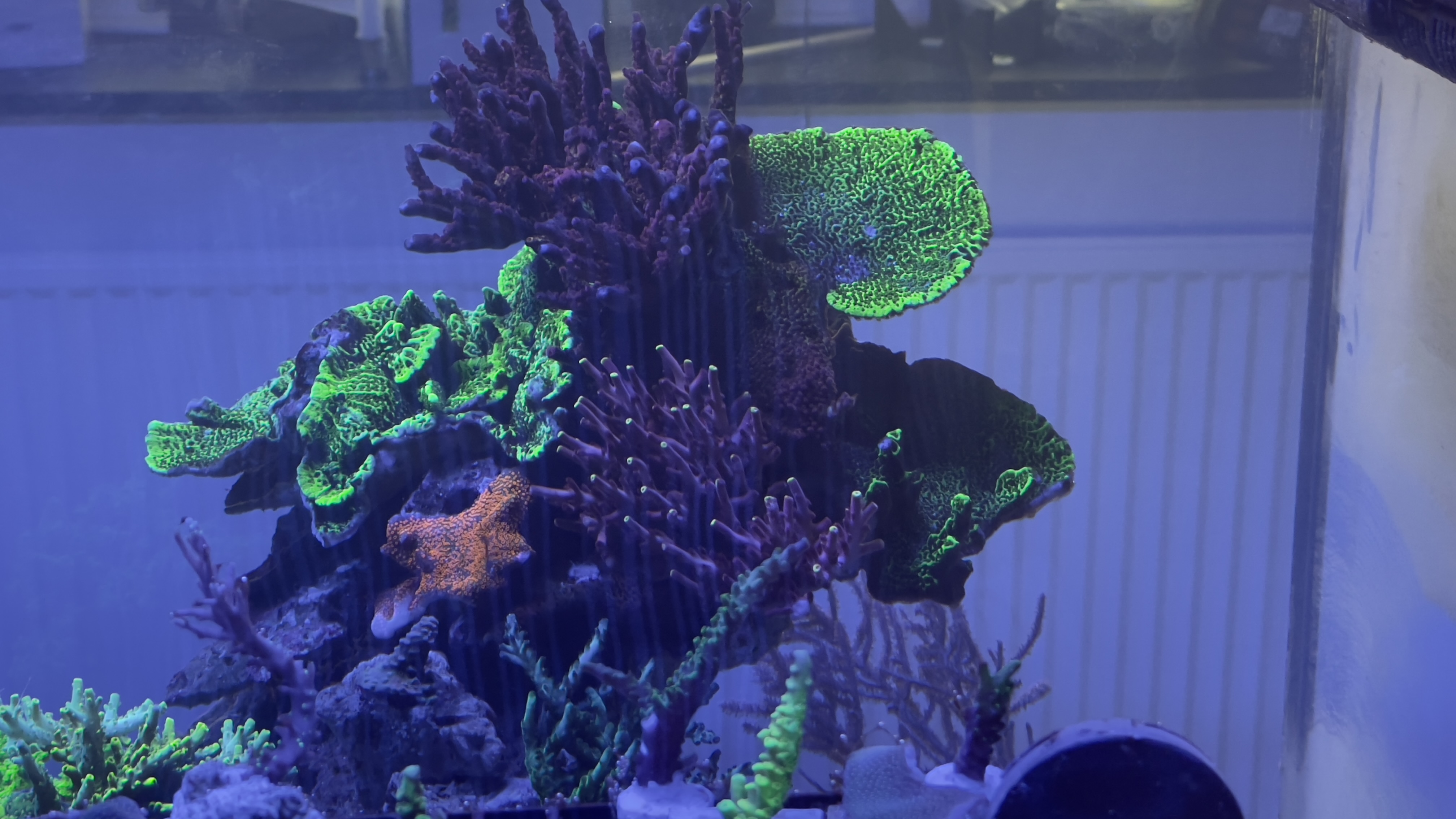 Koraller er ikke så glade for de nye placeringer, og PE er begrænset på acroporaerne i det nye setup, men synlige.