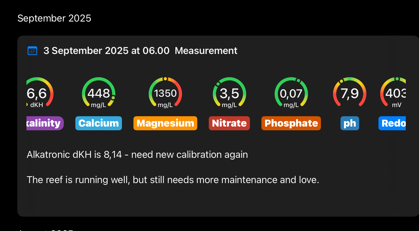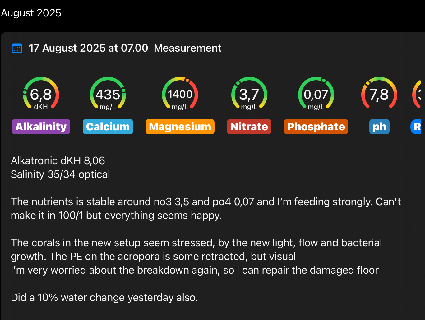 Næringen er utrolig stabil og flytter sig ikke meget. Det samme gælder parametrene for de 3 hellige, selvom KH ligger lidt i den lave ende. Det gamle setup kører perfekt og utroligt stabilt. Koraller ne viser stor vækst, men kan se efter mine hænder holder sig væk, er jeg ved at have et lille problem med de mange Asterina stjerner. 😱