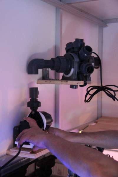 Heldigvis kan rørføringne jo skjules i vores store "lyskasse". Carsten havde heldigvis gode ideer til hvordan den kunne sidde på skrå over akvariet. Der skulle jo også tages hensyn til lampeplaceringen.