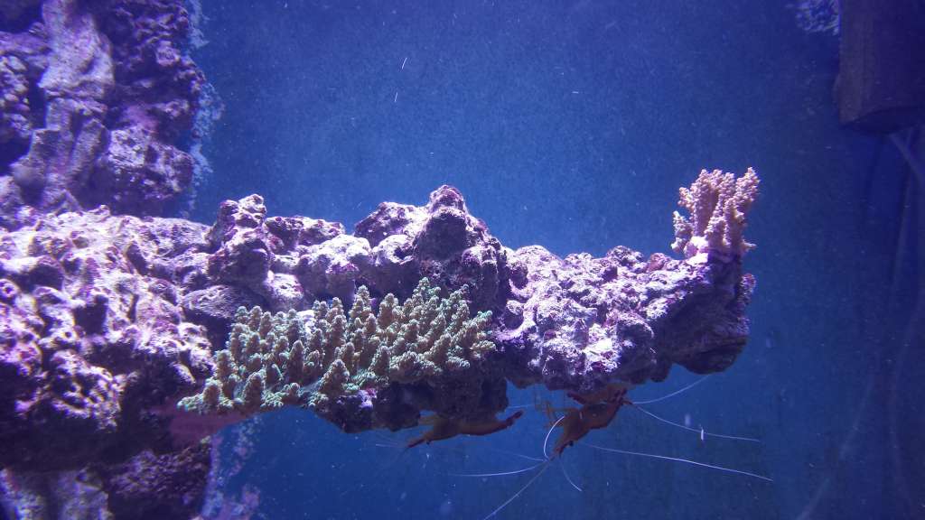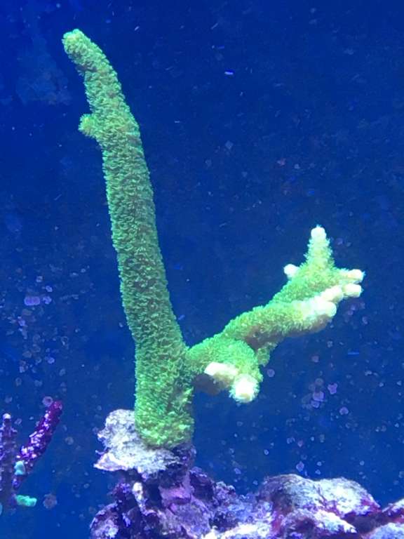 Så jeg har ikke haft fingrene i baljen i lang tid efterhånden, ja ud over at lime lidt koraller på plads, jeg er meget tilfreds med måden jeg hængte min grønne acro fra Australien. Den fik plads på mit "bedste" sted, eller der hvor jeg regner med at montere de mest eksotiske koraller. Derfor min min SSC lov til at blive i et stykke, så den med tiden kan komme at dominere lidt, og dominere kommer den at gøre, det ses desværre ikke på billederne (heller ikke på de nærbilleder jeg tog) men den er ved at komme sig rigtig fint. Den pastelgrønne grundfarve kommer tydeligt frem på den nye skud og topperne får fine røde farver, måske mere hen mod rosa, men jag håber den røde farve bliver mere tydelig.