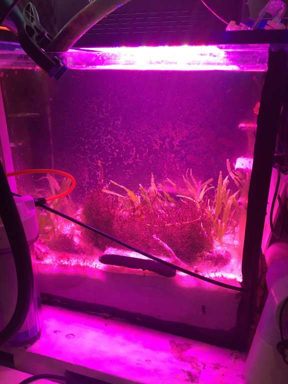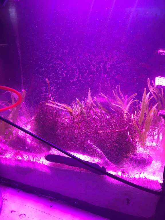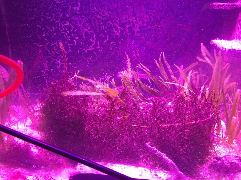 Lampen har en GROWTH indstilning som er belysningen på de fleste billeder, og så en BLUEM som er rød/rød :) jeg har læst mig til at man skal have både r'd og blå belysninger for at algerne skal trives bedst, men jeg ved ikke helt om jeg skal spare lidt på elregningen og slukke for BLUEM, starter uden alle røde LED og ser om der er noget der trives.