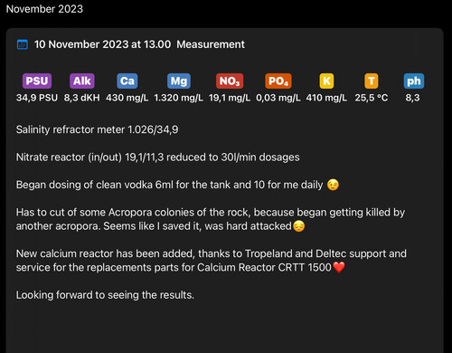 Du kan se hans tråd her, som måneds akvariumGino skrev: tors 23. nov 2023 17:31Ok ved du hvor mange liter vand han har?Seniorreefer skrev: tors 23. nov 2023 16:53Jeg ved @Holst har et mindre setup og har meget høj PH. Han bruger ca 100g hver 14 dage, i hans hjemmebygget co2 reaktorGino skrev: tors 23. nov 2023 13:04Ok ja det gir god mening men så skal jrg bruge noget mindre på mit lille rev på 182 liter.Seniorreefer skrev: tors 23. nov 2023 11:58Der kan vel være omkring 1500ml pr. reaktor, men jeg fylder ikke så meget i. Var kun første gang, og min PH steg helt vildt, så nu fylder jeg kun ca. 0,75l i pr gang. Skifter hver ca hver 2-3 uger, men du skal huske på jeg bruger kalkreaktor, så har en del co2 i omgivelserneJa ok det gir god mening! Hvor lang tid holder sådan en enkelt reaktor du har og hvor meget medie kan der være i hver?