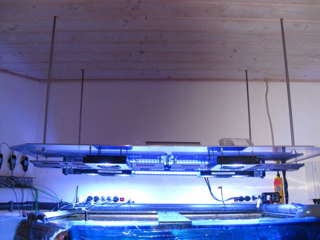 På loftet ligger en identisk aluplade som den der holder lamperne. Den plade er med rustfrie stænger monteret i den i akvarierummet.