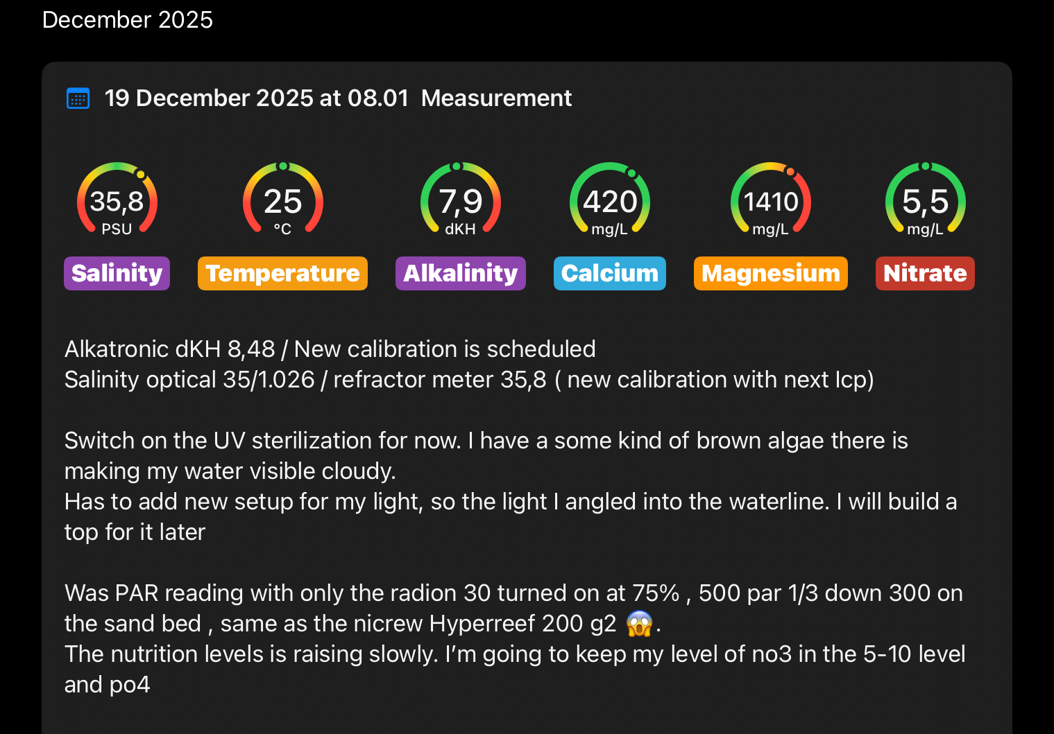 Fik lavet så de står skråt ned mod vandet og giver ufattelig dog spredning, samt support lys fra Kessil og orphek. Har ikke målt endnu hvad det tilsammen giver. Kører igen klimatisering på lyset Denne alge som jeg har er virkelig irriterende. Gør mit vand grumset og uklart, men efter jeg kører med uv nu aftager de langsom. Har ikke set den type alge før i opstarts fasen