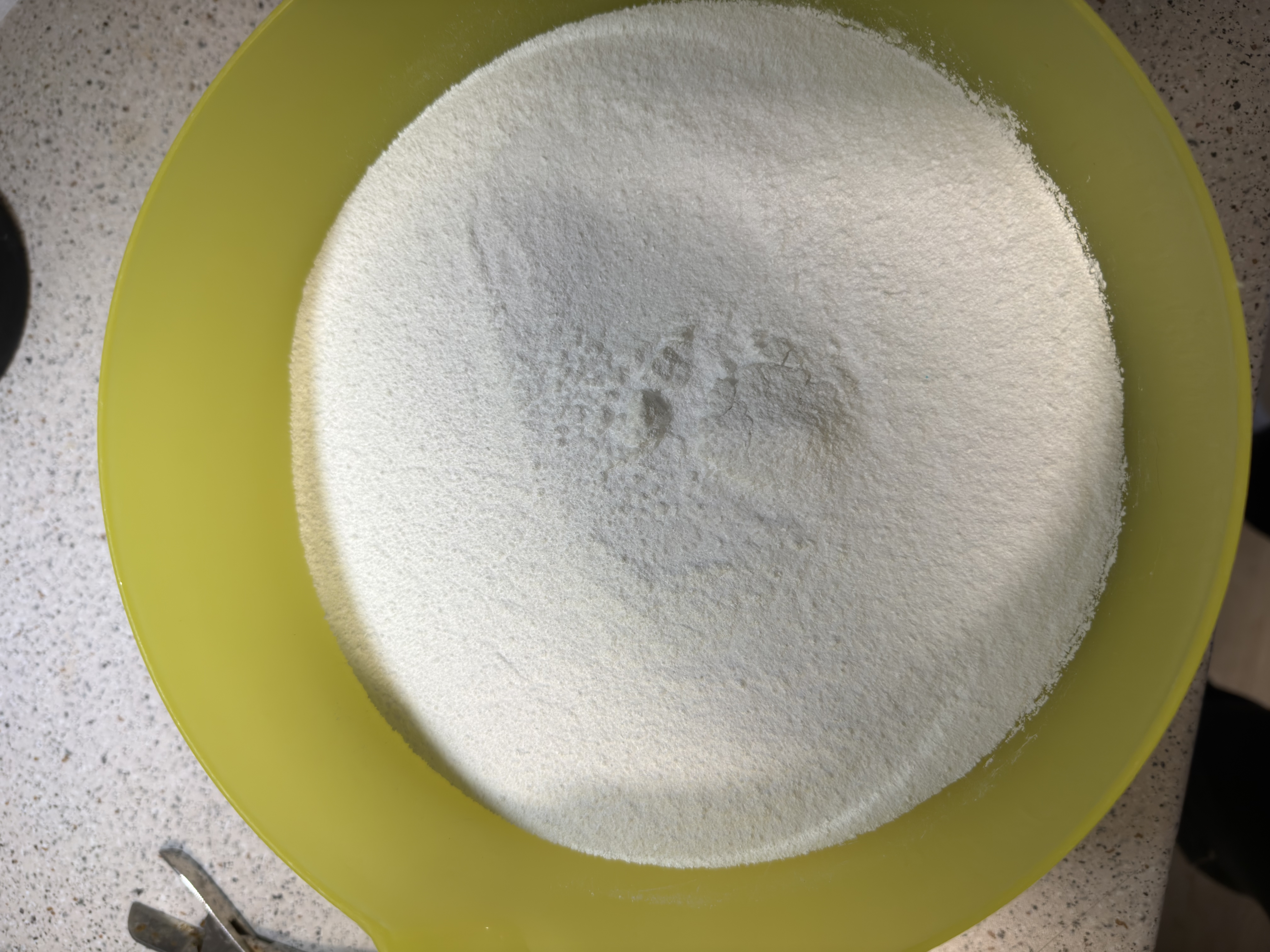 1 1/2 time efter opblandingen Her lige hældt salt i min 60l blå tønde. (Det er ikke helt 60 l kender faktisk ikke liter antal, da svømmeren jeg bruger til at stoppe fyldningen af ro vand sider samme sted hver gang, derfor altid har samme mænge og kan bare hælde mine 2440g i