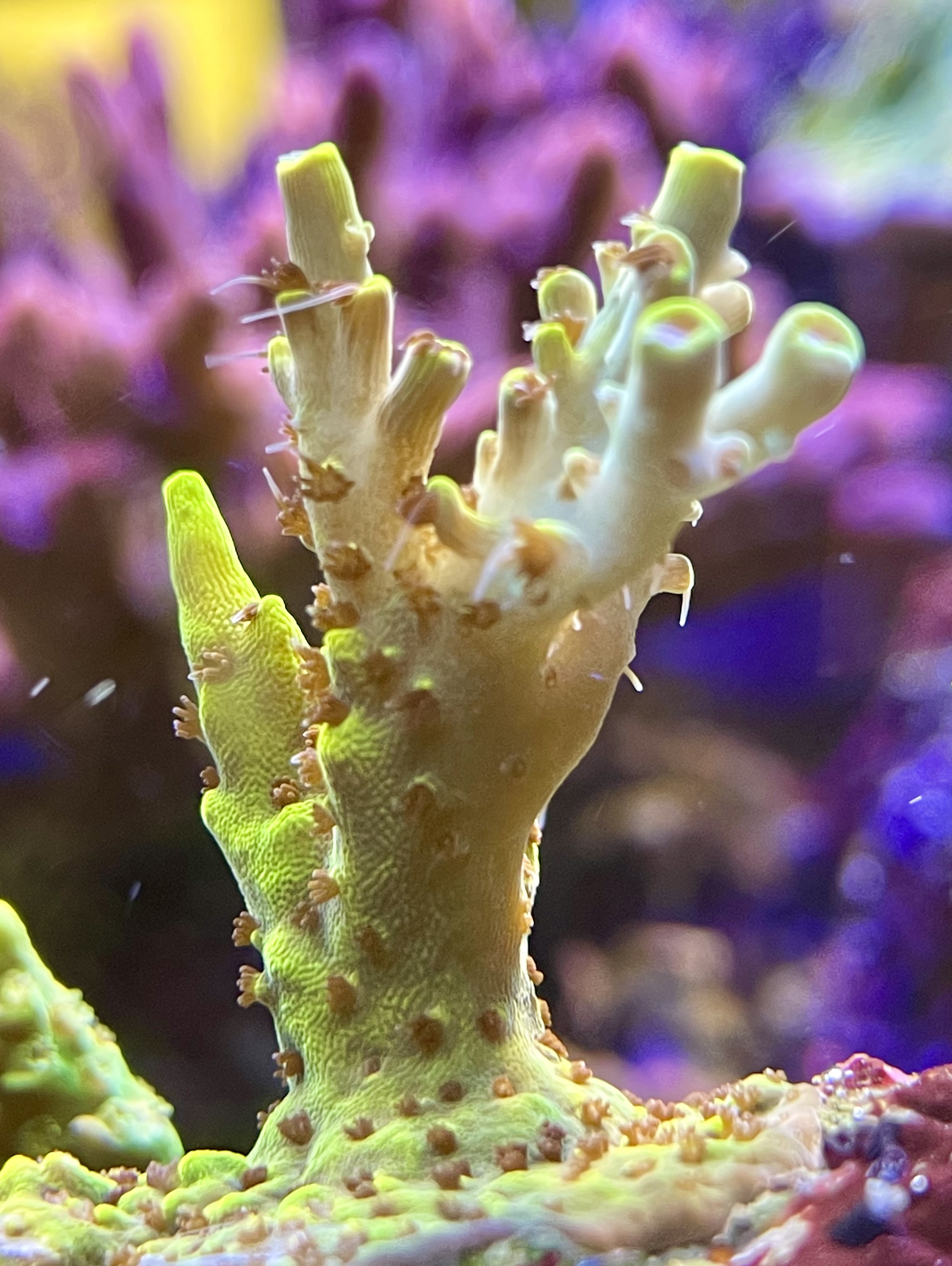 Tror det er billedet og White balance som er smuttet. De er knald gule spidser, men den bliver flottere dag for dag. Smuk koral i min optik
