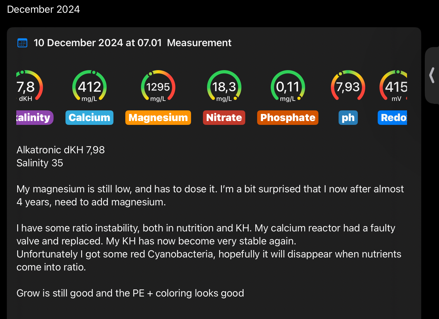 Mit magnesium er igen lav og bliver nød til at dosere fast på ugeplan nu. Har aldrig skulle dosere magnesium i næsten 4 år, så er lidt overrasket over det. Crazy Seahorse nævnte for mig på et tidspunkt han havde oplevet ligende.