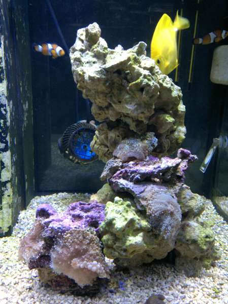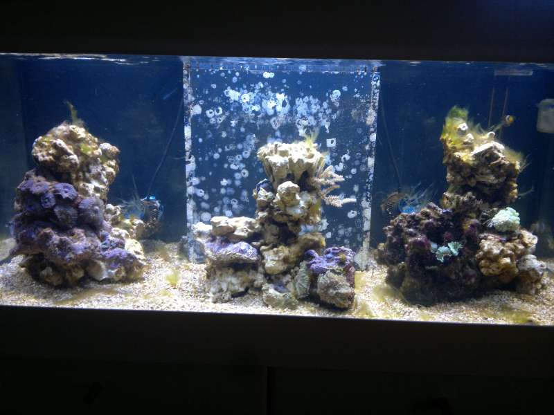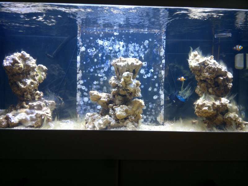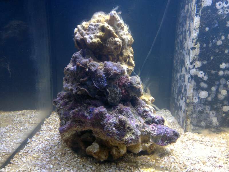 Jeg flyttede den lille sten med to skiveanemoner op på søjlen i højre side pga., at den stoppede for flowet, hvor den stod, og jeg lavede en DIY algefjerner (denne http://saltvandsforum.dk/viewtopic.php? ... ger+fjerne" onclick="window.open(this.href);return false;), og den virker bare, som man kan se på de nedenstående billeder