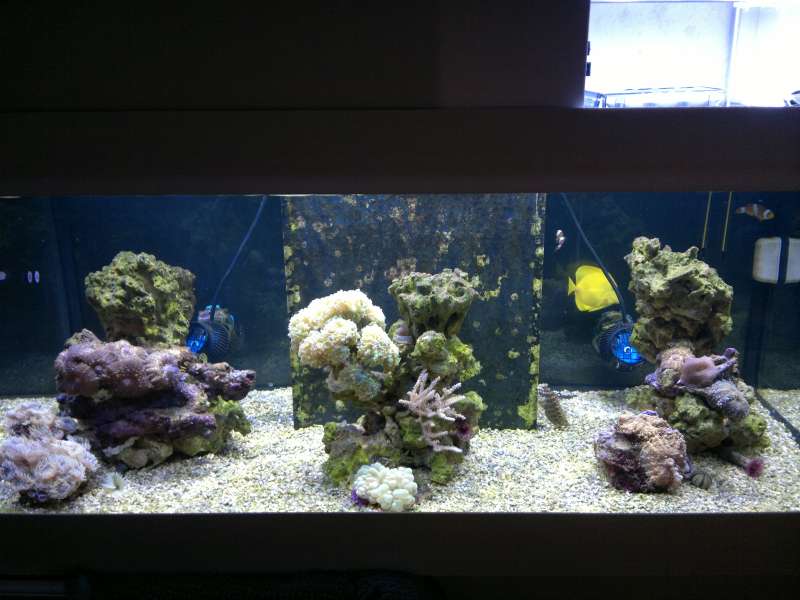 Har prøvet at fjerne nogle af de "mislignende" alger med en DIY algefjerne, og det har da pyntet lidt på det. Fik klippet det døde hoved væk på min Euphyllia glabrescens. Min Duncanopsammia axifuga er begyndt at se lidt trist ud. Jeg har fået alle mine hammerkoraller limet fast på midtersøjlen - så starten på en Euphyllia-garden er begyndt