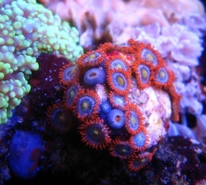 Men én ting jeg syntes er mærkeligt at se, er at jeg har samme type Zoa stående i hver af mine kar og de er FULDSTÆNDIG forskellige fra hinanden. i det ene kar er polypperene ca 2,5 cm i diameter, med lange halse og mørke farver. I det andet er hver polyp ca 8-9 mm, kort halse og meget mere skrigende farver.