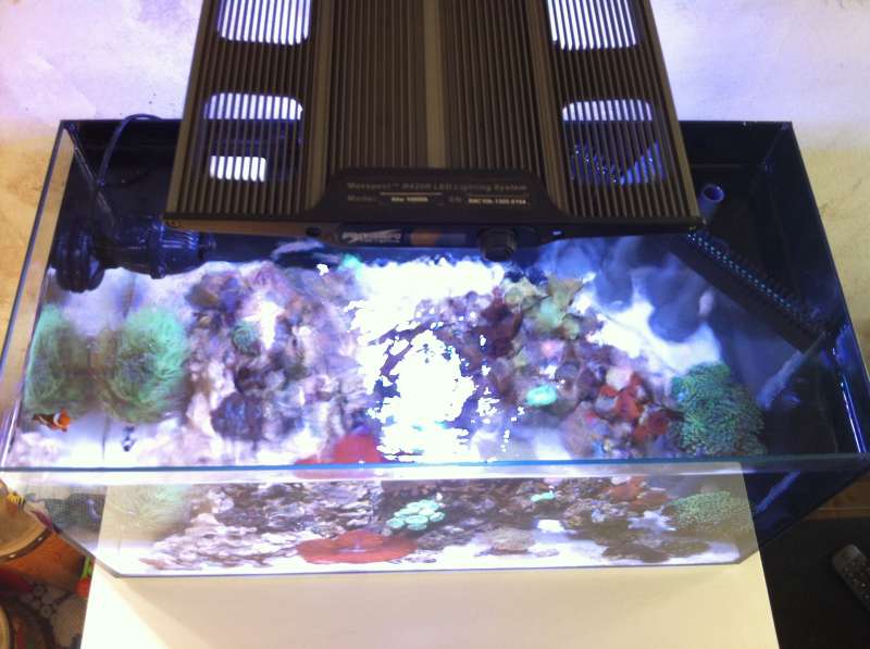 Ole: Jeg har en Maxspect nano 60w 10.000K over akvariet. Hvid: 80% Blå: 100%. Den kører med sol op- og nedgang på et forprogrammeret program.