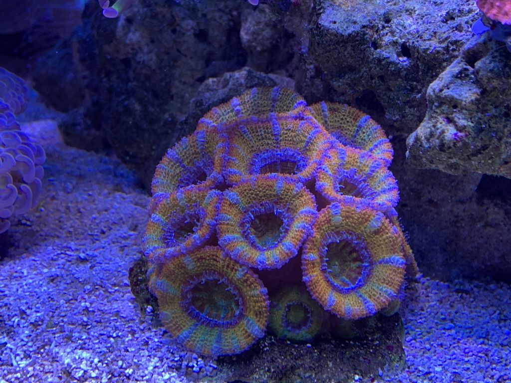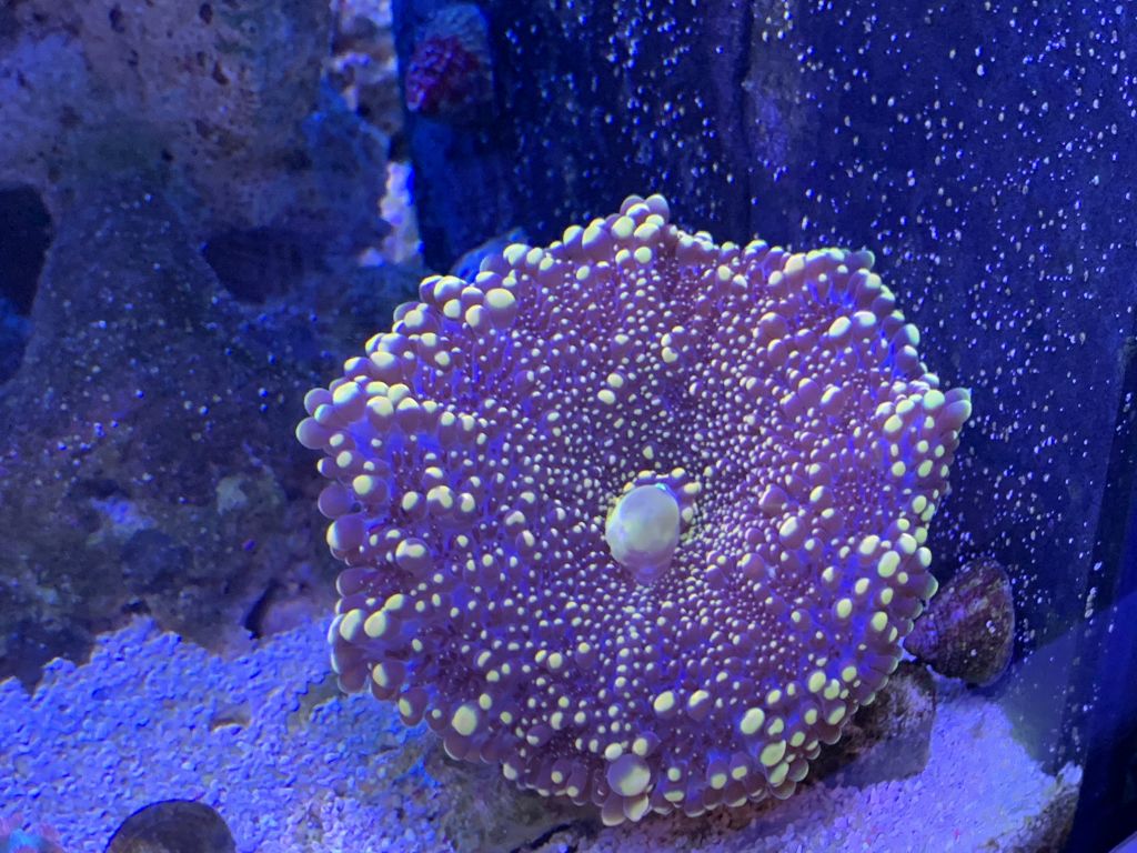 Har måtte flytte min Sour Apple Favia. Da mine acropora er begyndt at skygge for den , så den ikke fik optimalt lys, i den forbindelse fik jeg lige taget et billed af den under blåt lys, uden filter
