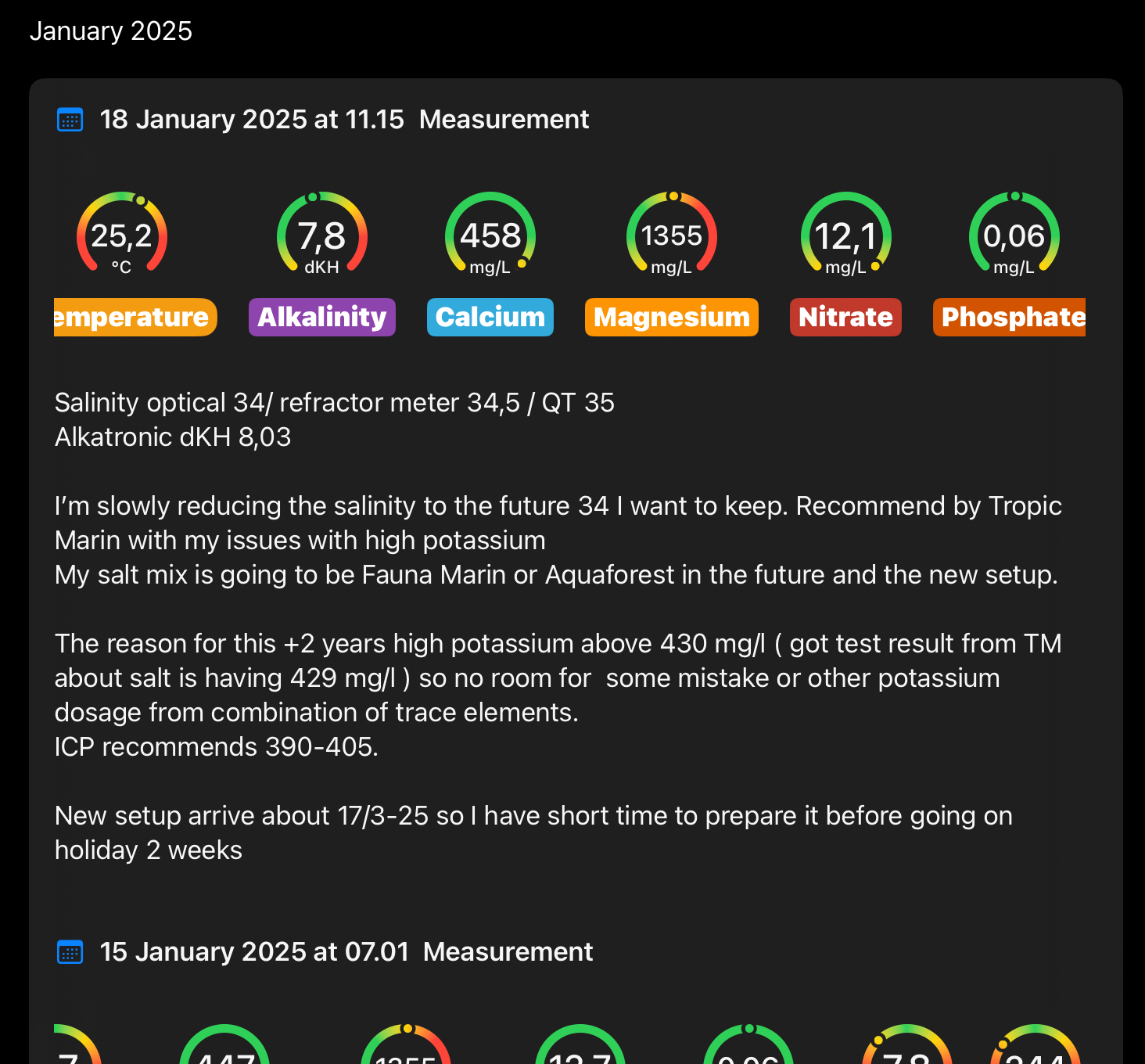 3. ved at sænke PSU til 34 ville det gennemsnit være 412. Derfor anbefalingen, da det virker som om du er overbevist om negativ effekt ved kalium 420+ (hvis nogen har en god kilde vi kan læse om det, så har jeg tid i nat efter bleskift til at læse) og det kan give ro i maven med en sænkning. Det skal siges at Leonardos Reef ligger på 420 kalium, målrettet, og man er velkommen til at sige til ham at hans acrofarver er dårlige. :)