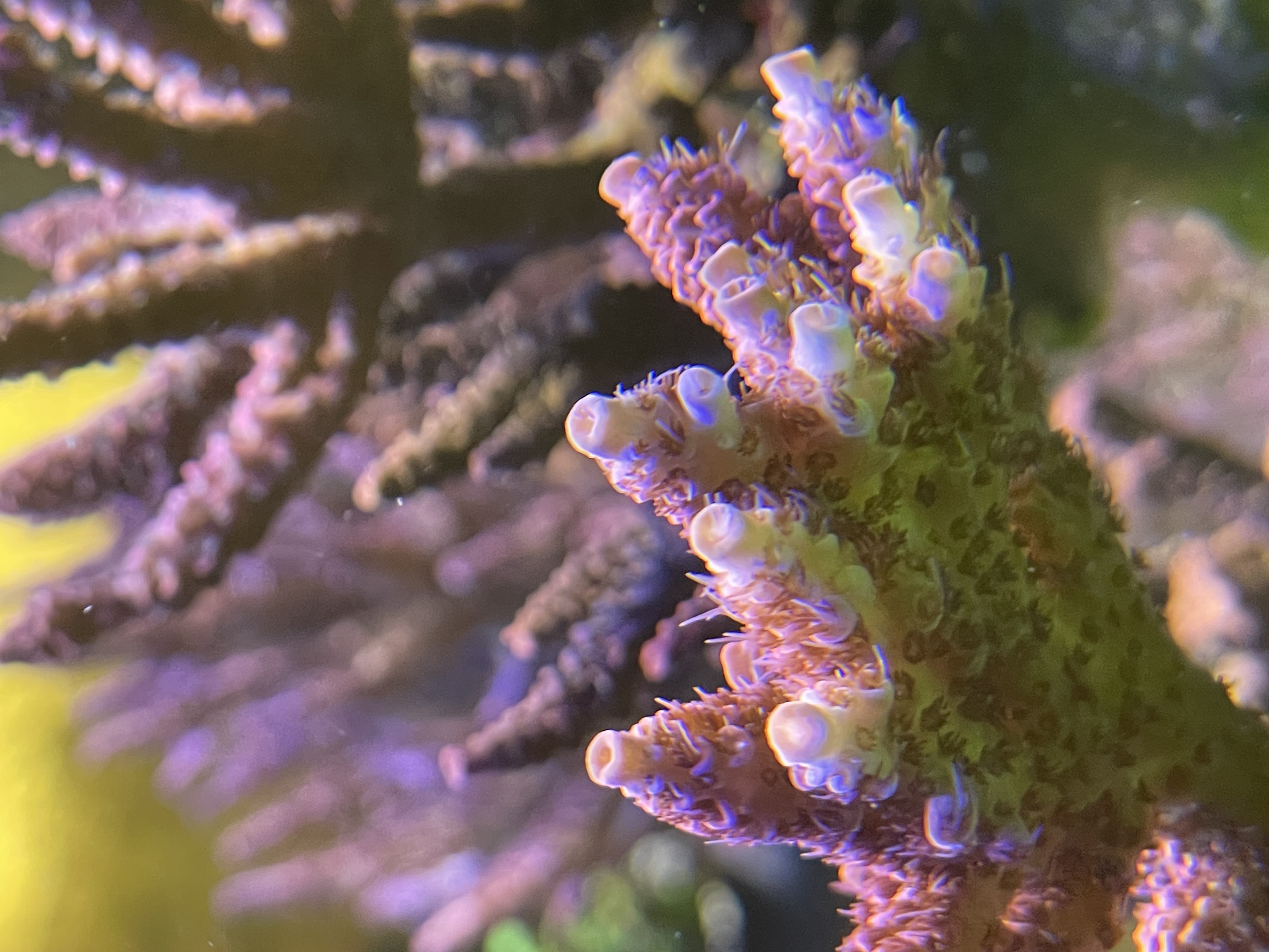 Generalt er der vækst på det lille rev med masser af vækstspidser på acroporaerne, så bliver spændende at følge det lille rev de næste 3 måneder, hvor overgangen til nyt salt og reducering af saltholdighed. Jeg begynder regulering af sporstoffer igen, men på enkeltvis uden Mix i fremtiden.