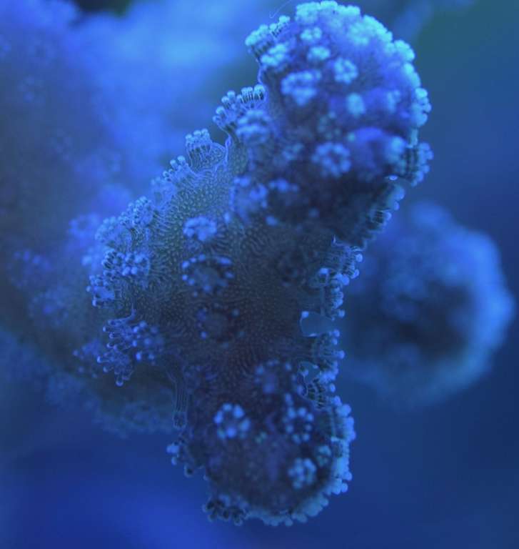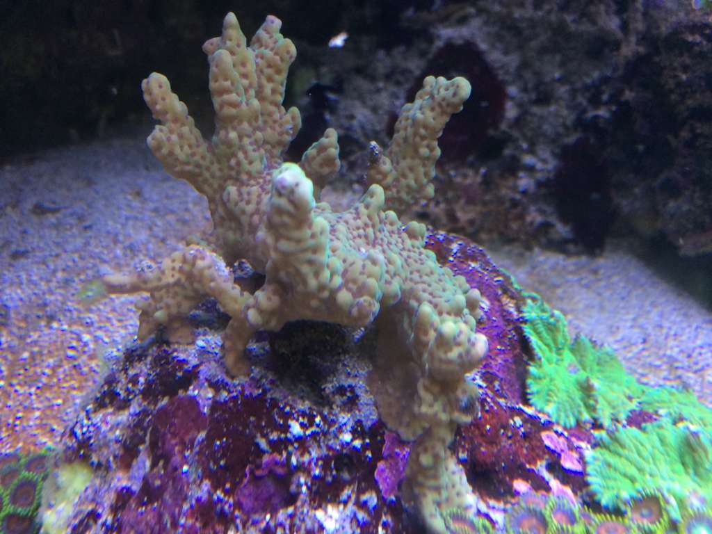 Det er en Stylopora pistilata. Den er noget anderledes farvet, end man normalt ser dem.