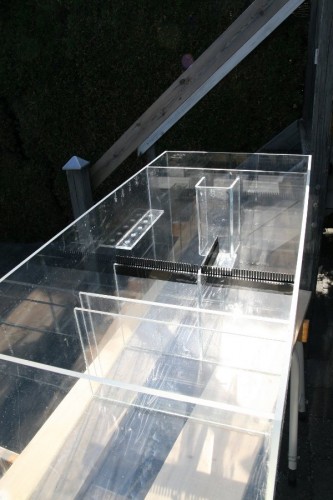Nu er jeg næsten blevet færdig med min sump, lige nu står det sidste til limning ude i solen, og når det er tørt skal det ind under akvariet, så jeg kan måle de sidste ting færdig, samle og lime de sidste rørføringer. Det er var godt nok lidt af en udfordring af lime den sump i plexiglas, mest at få et jævnt pres over hele limefladen når man snakker længder på over en meter. Jeg er rimelig tilfreds, og den er også tæt. Jeg fyldte den lige med vand i går, for at den kunne holde vand. Desuden har jeg givet den en ekstra gang lim i kanterne, så jeg er sikker på at den holder. Den skal jo stå skjult i skabet, så derfor er den heller ikke lige pæn alle steder. Hellere tæt end smuk ;) Men jeg har da fået lavet mit opdelte refugium med bubbletower, samt en probe holder.