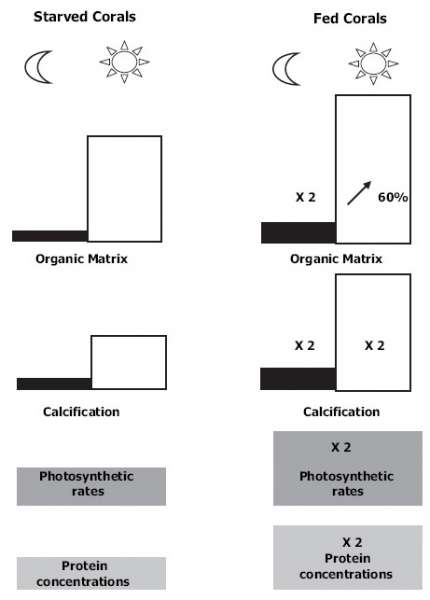 Some corals are able to shift the balance between energy gained from photosynthesis, particles and dissolved molecules when required15,30. Specimens which inhabit deeper waters receive less light, and bleached or azooxanthellate corals have to gain energy from other sources than photosynthesis. Montipora capitata colonies have been found to increase their plankton feeding rates after bleaching, which completely satisfies their daily metabolic requirements12 (table 2).