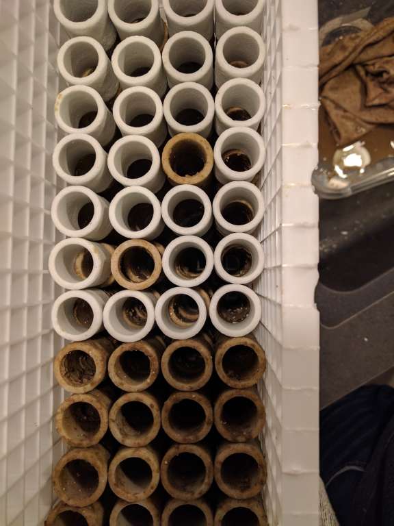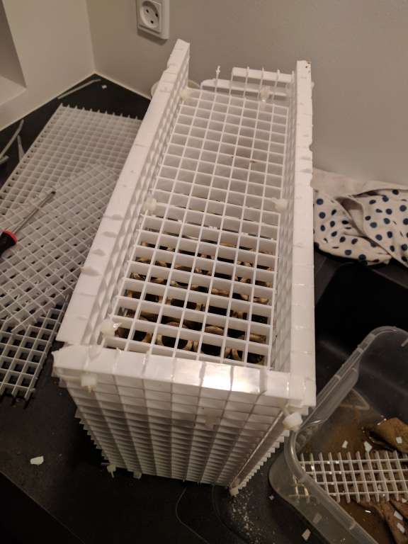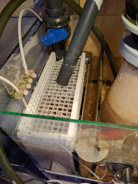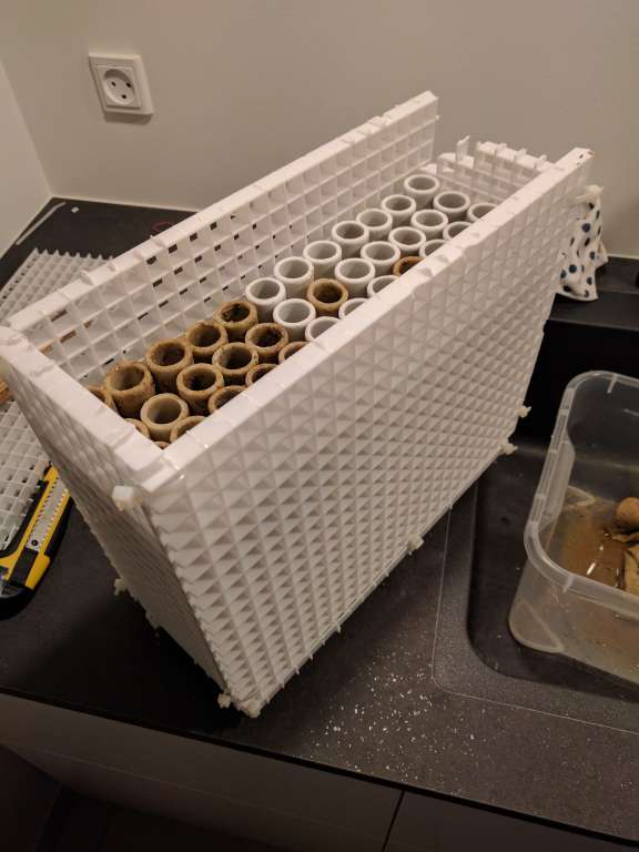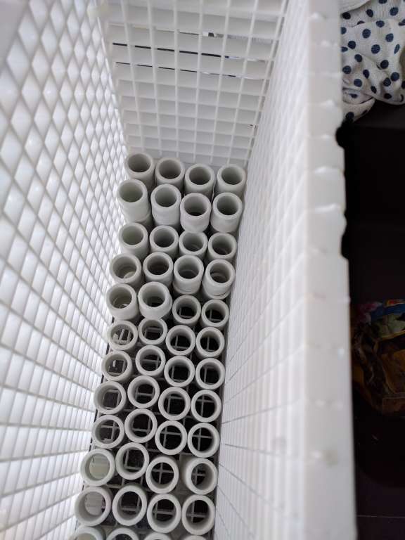 Ved Fiske hulens åbning, blev der købt blandt andet 6 stk squamipinnis, og en 5 stk extra chromis, så jeg nu har omkring de 12 chromis, og 2x Macropharyngodon bipartitus gylter. Håbet er disse kan være med til at sørge for jeg kan holde en no3 på omkring 2... Men selv med disse nye fisk, og en hård fording ( 5x frost terninger om dagen + godt med tør foder), har jeg 2 gange i løbet af ugen hævet no3 fra 0 til omkring 2-3 stykker, og po4 fra 0 til et sted mellem 0,024 og 0,045. Jeg tog derfor ned i Lørdags og købte flere Anthias, det blev til 6 Dispar anthias, så der nu er 7 i mit akvarie, og 5 stk Cooperi Anthias. Der er blevet fodret endnu mere igennem nu, da de jo også lige skal lære at tage foder, er spændt på hvor længe systemet kan holde til dette. (Jeg hader at overfodre, det har det med at ramme som en boomerang lige pludselig).. Derfor har jeg været igang idag med at gøre så mine Siporax filter, fungere bedre. Pt er der vel en 20l i mit akvarie, fra det gamle akvarie, som bare var smidt i filter poser. Disse har vel kørt i 1½ til 2 år inden de kom over i det nye. Jeg har været igang med at lave en kasse af eggcrate, hvor de bliver stablet i, så de ikke så let slammer til. Som i kan se på billederne var de noget beskidte, dog ikke så meget som jeg havde troet. Havde ikke lige tid til at gøre dem rene, de blev blandt med lidt friske Siporax. Planen er der skal være en ligende kasse ved siden af skummeren. Jeg er virkelig imponeret over hvor effektive de Siporax kan være, selv når de bare ligger i poser, hvilke ikke er optimalt..