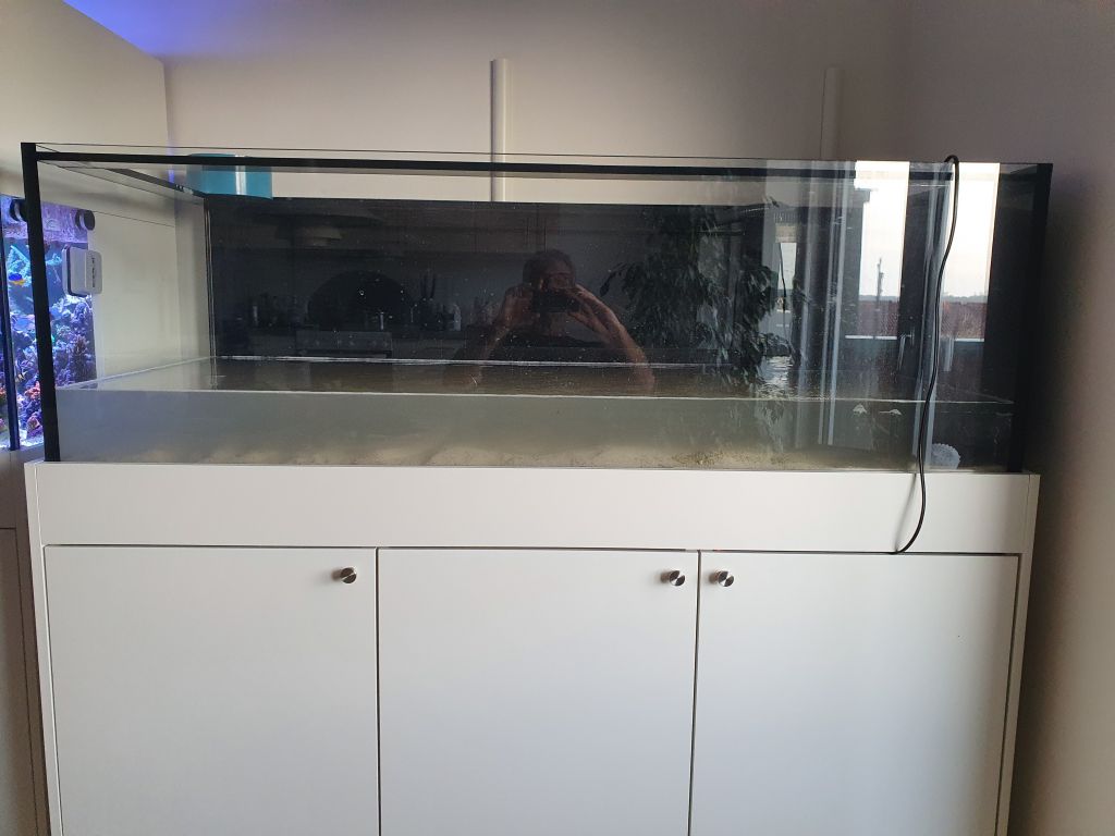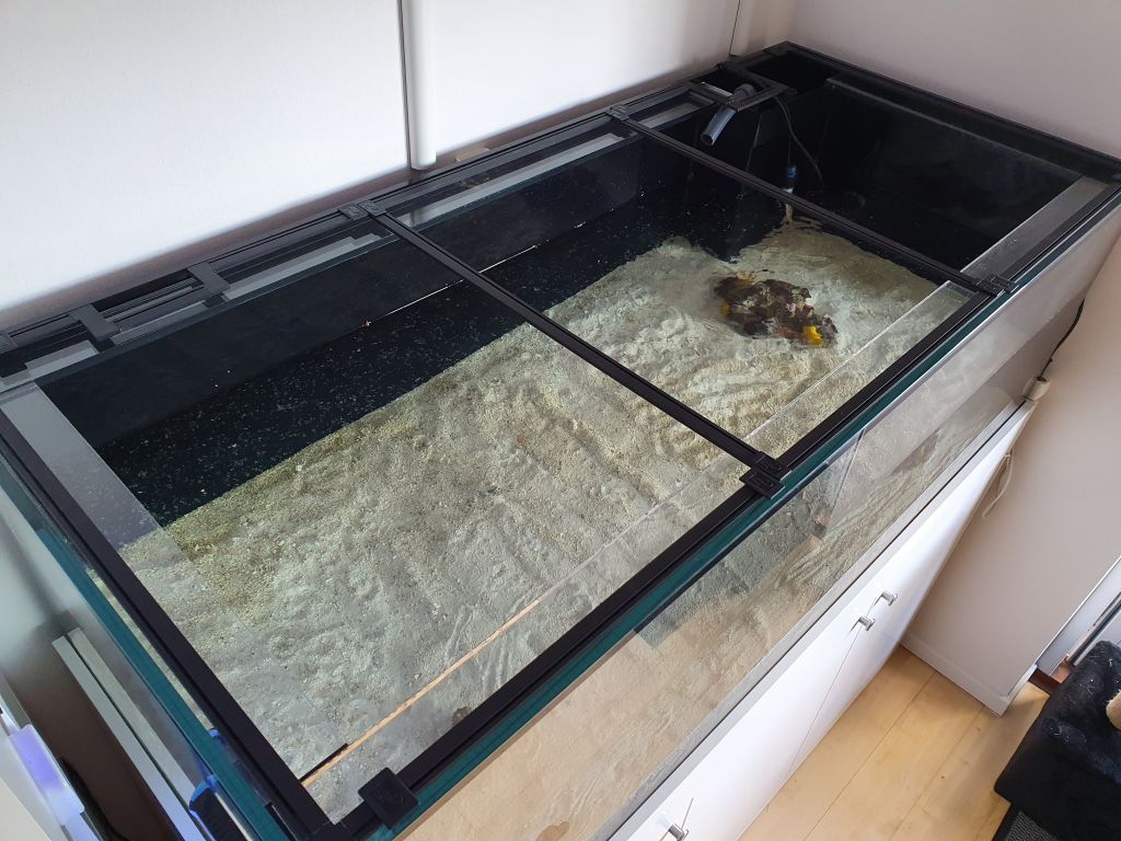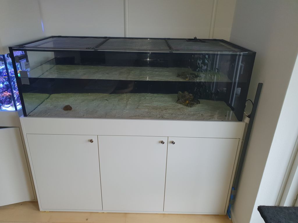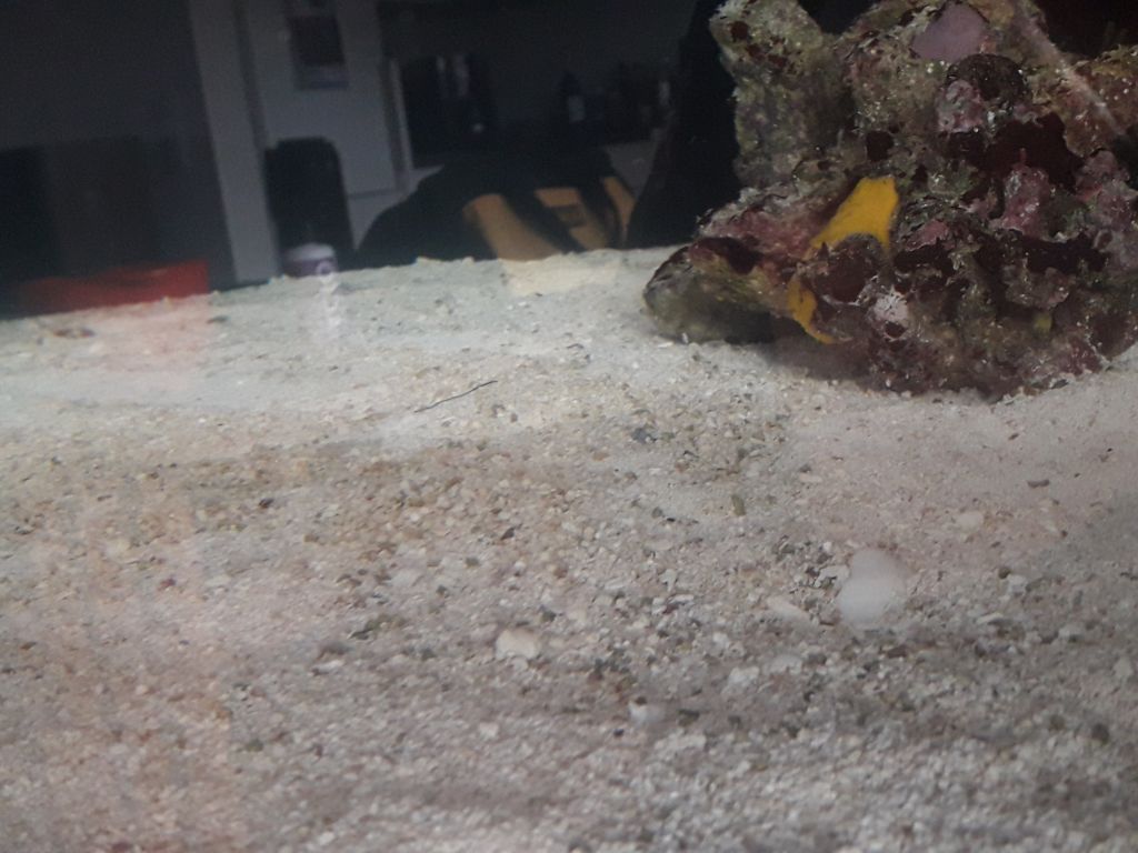 Jeg har efterhånden smidt ca 50 kg sand i, der dagligt bliver suppleret med to kopper sprællevende sand fra mit gamle akvarie og jeg kan allerede se spagetti-orme, børsteorme og nassarius snegle i bundlaget
