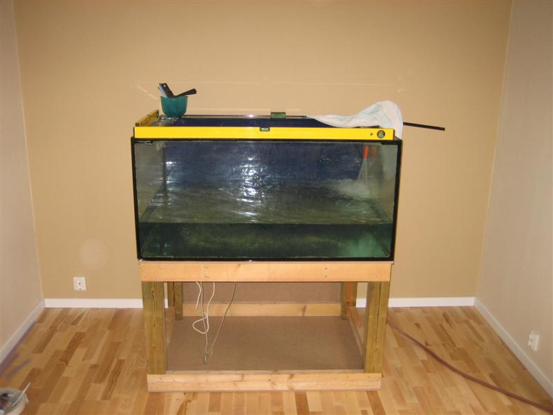 Lige nu står akvariet på bordet ude i garagen. Det trænger mildest talt til en regøring. Bordet skal der også laves lidt ved så der er lidt at give sig til.