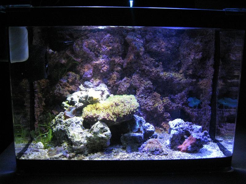 Akvariet er lavet af Jens-Jørgen og er på ca. 35 liter. Det er mit første saltvandsakvarie, har dog haft ferskvand i over ti år. Jeg har det sidste år læst diverse opstarts og begynder artikler om saltvand på nettet, samt læst bogen Reef Secrets.