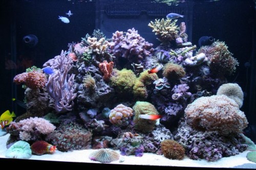 Jeg er selv startet ud med 50kg LS fra Caribien for 4 uger siden med modnet saltvand (ikke fordi jeg tror det har den helt store betydning) og levende sand fra Australien. Det hele købt hos Akvarieudstyr.dk. Der er monteret 2* Tunze 6045 i akvariet og jeg holder med alle blæsere tændt en temperatur på ca. 25-25.9 grader dagligt. Til sommermånederne er der monteret en Boyu 75 i underskabet. Tunze Osmolator er købt, men endnu ikke monteret.