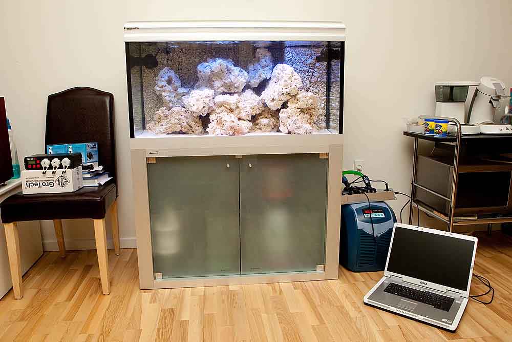 Det nye akvarie bliver fyldt med modnet vand fra Decocean samt noget nyblandet saltvand. Forholdet mellem disse to er endnu ikke afgjort. Jeg ville egentlig have begyndt helt forfra, men jeg skal have mine tre fisk samt koraller over fra mit gamle akvarie med det samme. Derfor bliver det denne løsning.