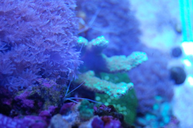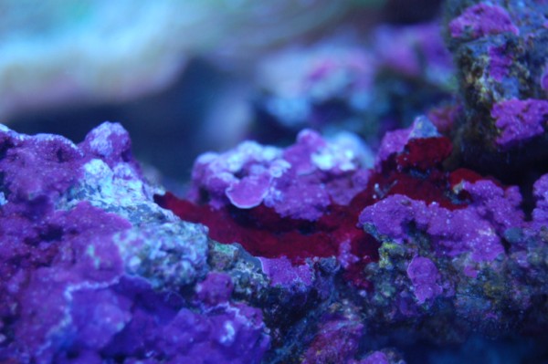 Det hele kører og tingene virker meget stabilt (7-9-13) Ingen alger af betydning, kalkalgerne gror som sindsygt. En keramisk kogeplade afskraber er igang ugentligt for at holde de røde plamager væk fra ruden
