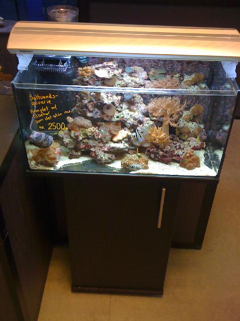Da min søn ikke havde den store lyst til at have sit nano akvarie på værelset mere, tog jeg det ned til butikken og brugte det som udstillingsakvarium. Nu hvor vi lukker saltvandsafdelingen, sælger vi også min søns gamle akvarie.
