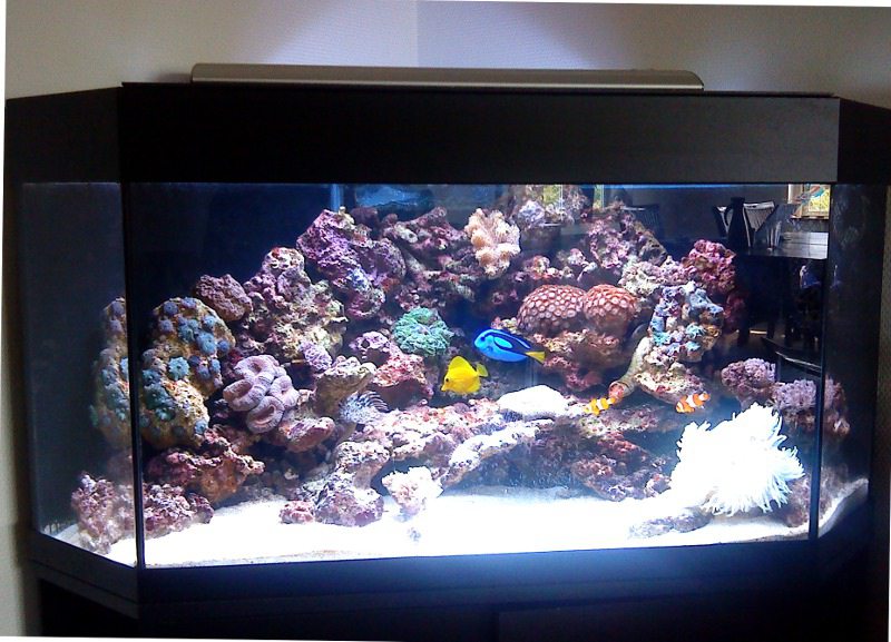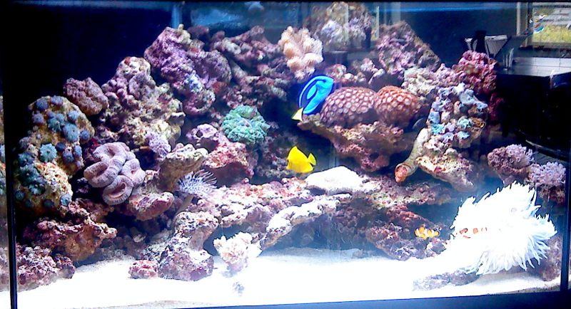 Det er ca 3 mdr siden der kom vand i, og evter ca 2 mdrs utålmodighed fra en "bekendt i huset" ... røg der klovne + eremitter + hugo i baljen. Disse har igår fået selskab af Bi-color + palet + rejer.