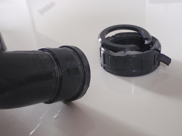 Det der gevindstykke som er gået i stykket skal ind over enden som ses på det midterste billede, men så skal jeg jo have skilt den 90 graders bøjning af, men den er limet på..? hvad gør jeg?