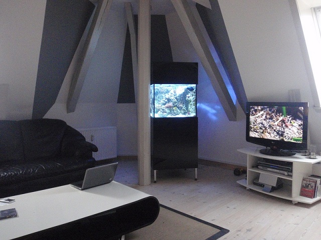 Akvariet står på Porsabord, hvor der er lavet plader som et skab uden på. det er malet sort, og jeg har idag selv lakeret det højglanssort.