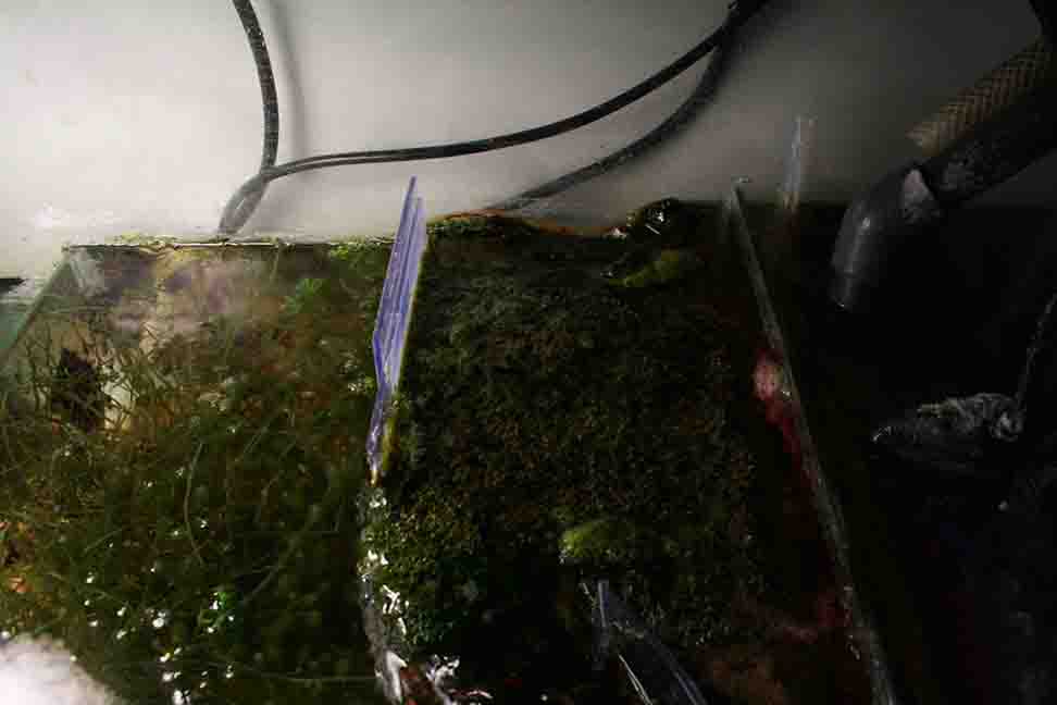 ats: hjemmebyg m. 900l/t hævepumpe, et ridset skærebrædt fra ikea, en skråtstillet risleplade limet i plexiglas, og en 38w arbejdslampe fra harald skrald a/s.