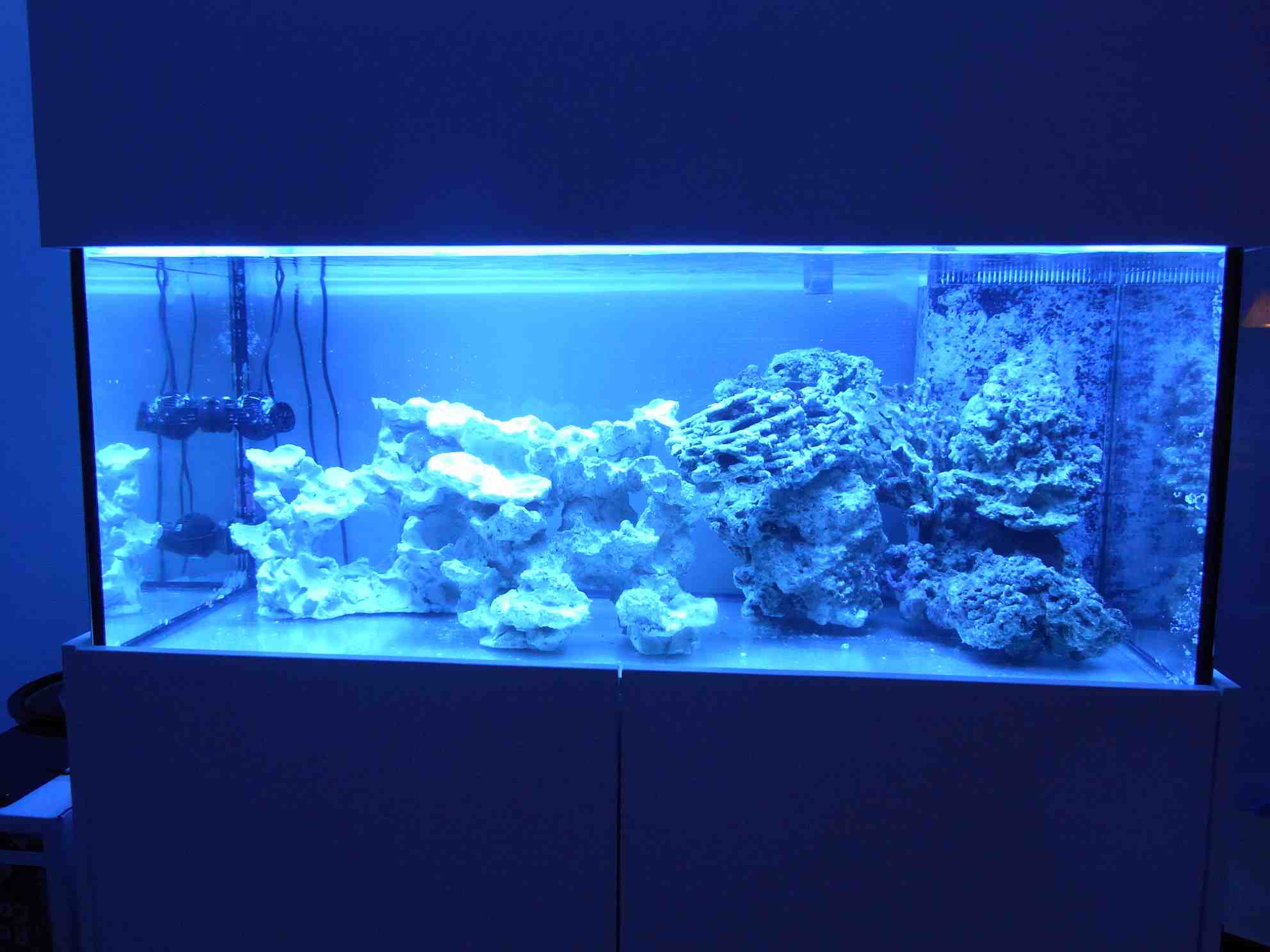 Har fået sat en blå acrylplade bagpå. Det hjælper på akvariets fremståen. Er så småt ved at komme "støvet" til livs der spredte sig i hele akvariet da jeg satte Rowaphos til at køre i reaktor...føj for et svineri...bare se bagvæggen...