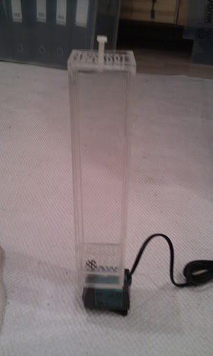 Derfor besluttede jeg mig for at konstruere en reaktor selv af et par akryl plader. Selve kassen er limet sammen af 4 stk. 3x50x250mm plader. I bunden sidder en new-jet 600 pumpe i en plade (monteret med den medfølgende studs), og 2-3cm over den sidder endnu en plade gennemhullet af 2mm huller. I toppen har jeg ligeledes en gennehullet plade jeg har fæstnet med en nylon bolt (der skrues ned i en tværgående og gennemgående 3x10 mm akrylplade).
