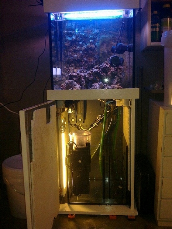 Jeg mangler stadig en sump 40X40X40, havde egentlig fundet en i akryl, men tør sku ikke løbe chancen, skummer er sat direkte i akvariet (shit den fylder), lys er sat op, osmose er nødtørftigt sat til.