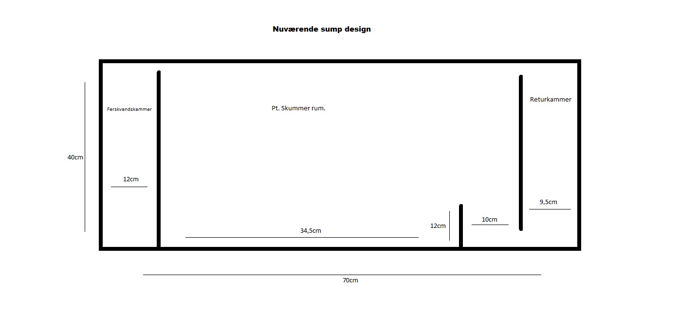 I sumpens nuværende design fylder skummeren med andre ord ca. halvdelen af det rum jeg på tegningen her under kalder "Skummer rum"
