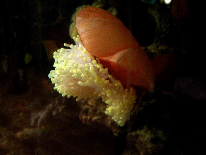 Anemone ser ud som om den er ved at falde ned, den har løsnet sig fra stenene og hænger kun i en enkelt lille hudlap