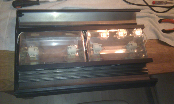 så sku de sidste ting monteres. de reflektore som sad til t5´erne, klippede jeg til i længden så de ku sidde mellem led natlyset. med hnblik på at klemme to stk pl 24w ned i. acrylglassene blev lige ledes monteret. dog med den lille ændring, at jeg måtte bore huller i til natlyset. da led pærene sad 5 mm for højt til at det ku køre hen over.