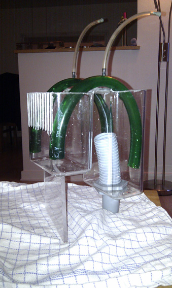 overløbet er lavet af 2 stk plast beholdere fra brugsen til ca 40 kr. og når mand bor på bornholm som jeg og ikke har en saltvands biks rundt om hjørnet, købte jeg i det lokale byggemarked en rørgennemføring til en regnvandstønde istedet. samled pris for overløb. ca 100 kr