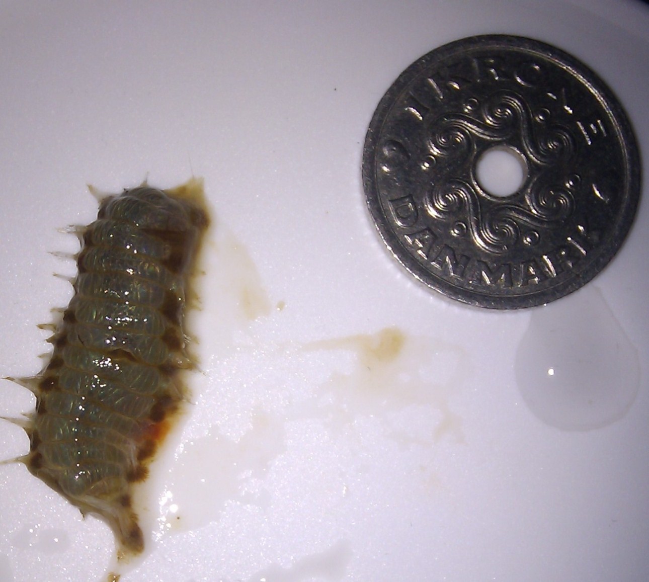 Jeg fik min nye mantis fra bkynde i søndags, og har ikke set den siden, på trods af mine forhåbninger om at den ville komme frem for at æde reje og laks på spid. Der tog jeg fejl, for imens jeg har bekymret mig for om den gad æde maden, så har den hellere ville gå på jagt, og sørme om den ikke fangede noget: resterne af en børsteorm, og en stor én at dømme ud fra stumpen der er tilbage. Mønten er en enkrone. Mantis'en er iøvrigt omkring 4-5 cm i længden.