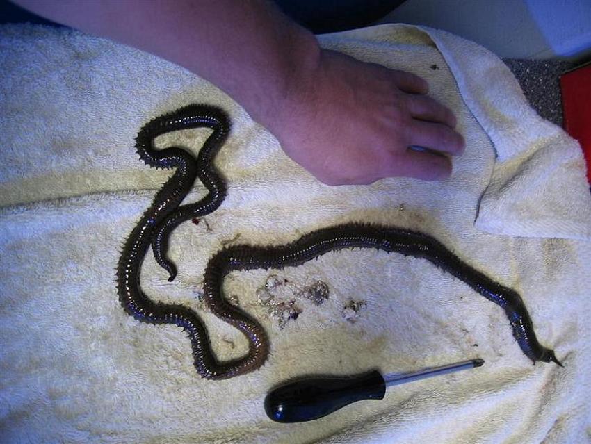 Har lagt en fælde den, bestående af en nedløbsrør der er helt lukket i den ene ende og så stort set lukket i den anden, der er kun broret et lille hul i den ende. Inde i fælder ligger der fodder. Ideen er at ormen kravler ind i fælden gennem hullet og blive der inde. Desværre er den dog klogere end så. Den stikker kun noget af kroppen ind, tager noget fodder og trækker sig så tilbage igen lynhurtigt....