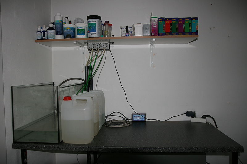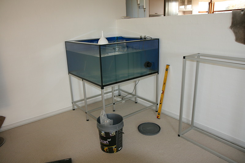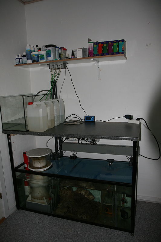 Så fik vi lukket og solgt det gamle 720 L, og startet et nyt og mindre akvarium op i det nye hus. Da det nye står op af en halvmur er teknik og sump flyttet ind på den anden side af en mur, ind på kontoret, hvor det skal indbygges i et skab så det ikke bliver et problem med larmen på kontoret.
