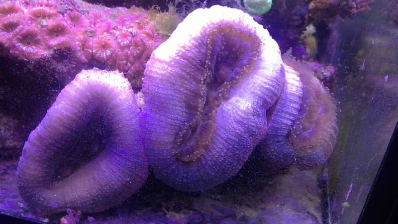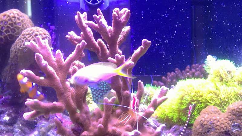 Akvariet indeholder 2 sps, nogle lps lidt polypper og skiver og en enkelt blød koral.