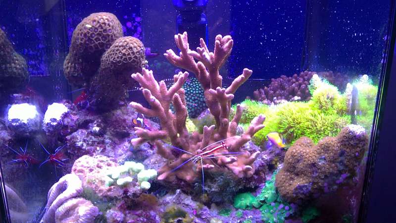 Af fisk er der en klovn percula og en enkelt antias, som kommer fra mit gamle 500 liters , 2 kardinal rejer, 1 danebrog,1 blå søstjerne , 2 tangnål + andet, jeg ikke husker navne på.
