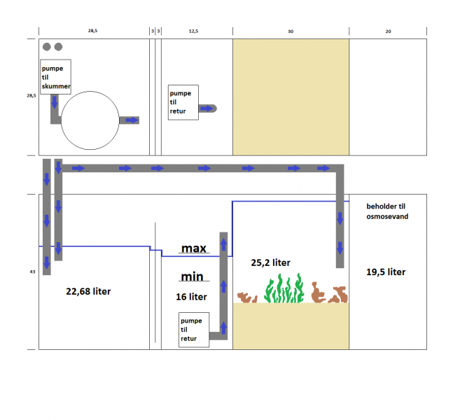 Brøker skrev:jo vandstanden må max være 20 cm høj, og mit spørgsmål er hvor høj skal den første væg være.. altså fx 15 cm høj, så der stadig kan løbe vand over til retur pumpen.