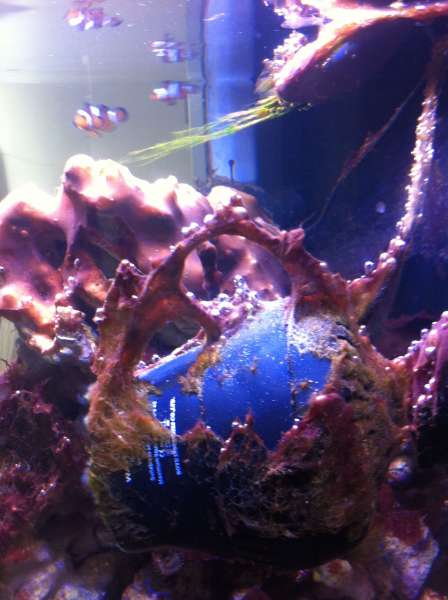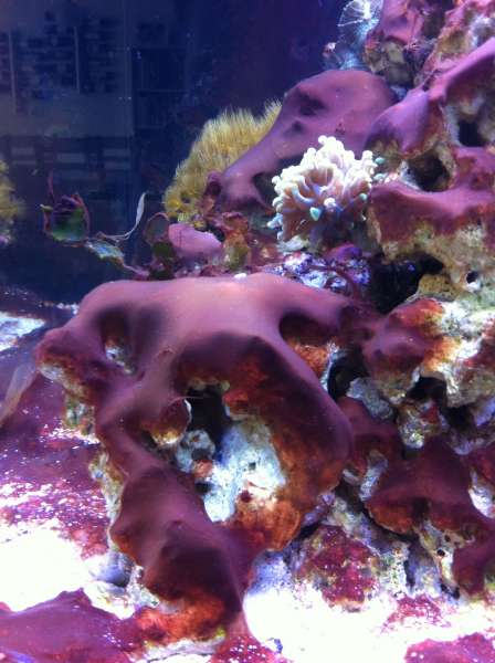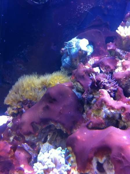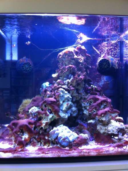 Det er et nyt akvarie, på 150 l + 80 l sump, startet op med døde "levende sten" og "levende" sand. Efter ca. en måned kom jeg ca. 3-4 kg levende indkørte sten i (mit lille 30 liters blev lukket ned) der kom også lidt sand 2 klovnfisk og lidt forskelligt snegle krebs osv. i lidt senere kom der CUC i.